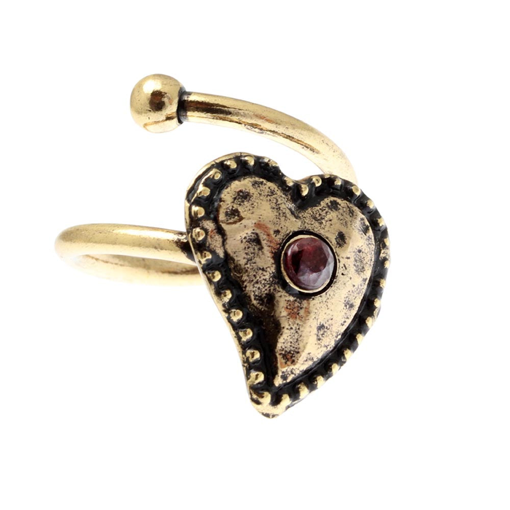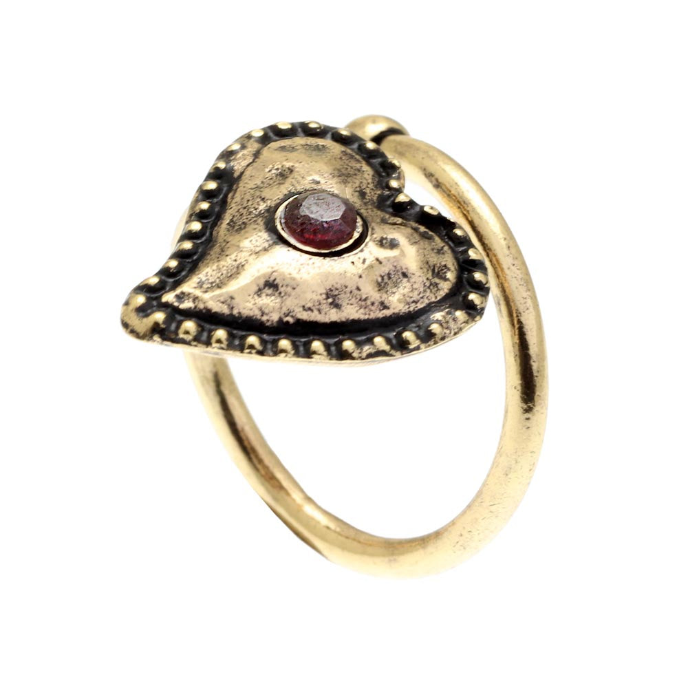 Anello in ottone dorato interamente realizzato a mano, impreziosito da un elegante cuore con centro in granato naturale. Un pezzo unico che cattura lo sguardo con la sua delicatezza e il calore del colore rosso profondo della pietra. La misura regolabile lo rende perfetto per ogni dito, garantendo una vestibilità confortevole. Ideale come regalo significativo o come tocco romantico al tuo stile quotidiano. Dimensioni: 1,9 cm di altezza e 1,2 cm di larghezza.
